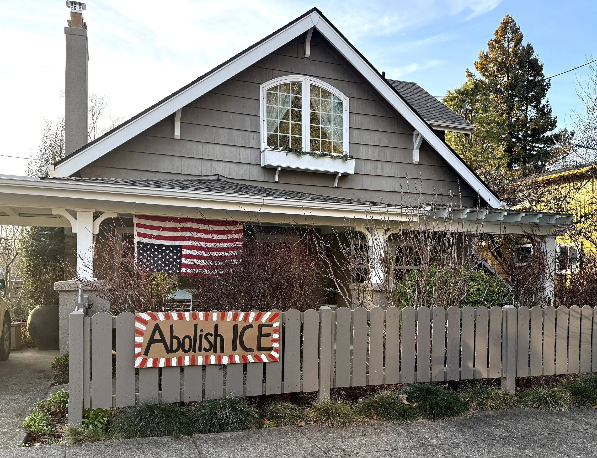 I am in a couple of shows in February, so wanted to share those dates and times with you. I have not been making art lately, but I have been painting a lot of protest signs. Which has been very fulfilling because I paint bunches of signs and bring them to rallies to share. Above you can see my little house with my upside down distress flag and my Abolish ICE sign.