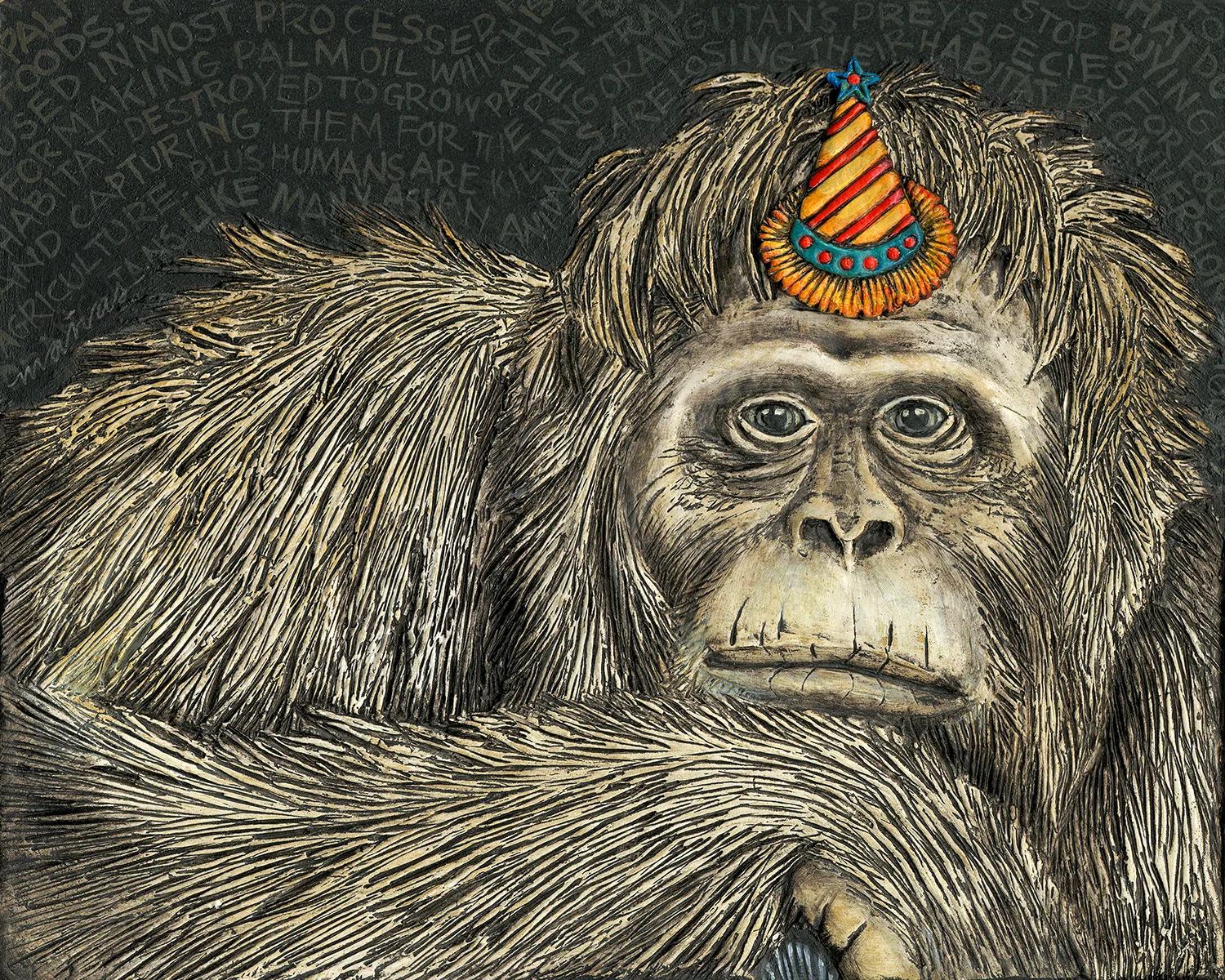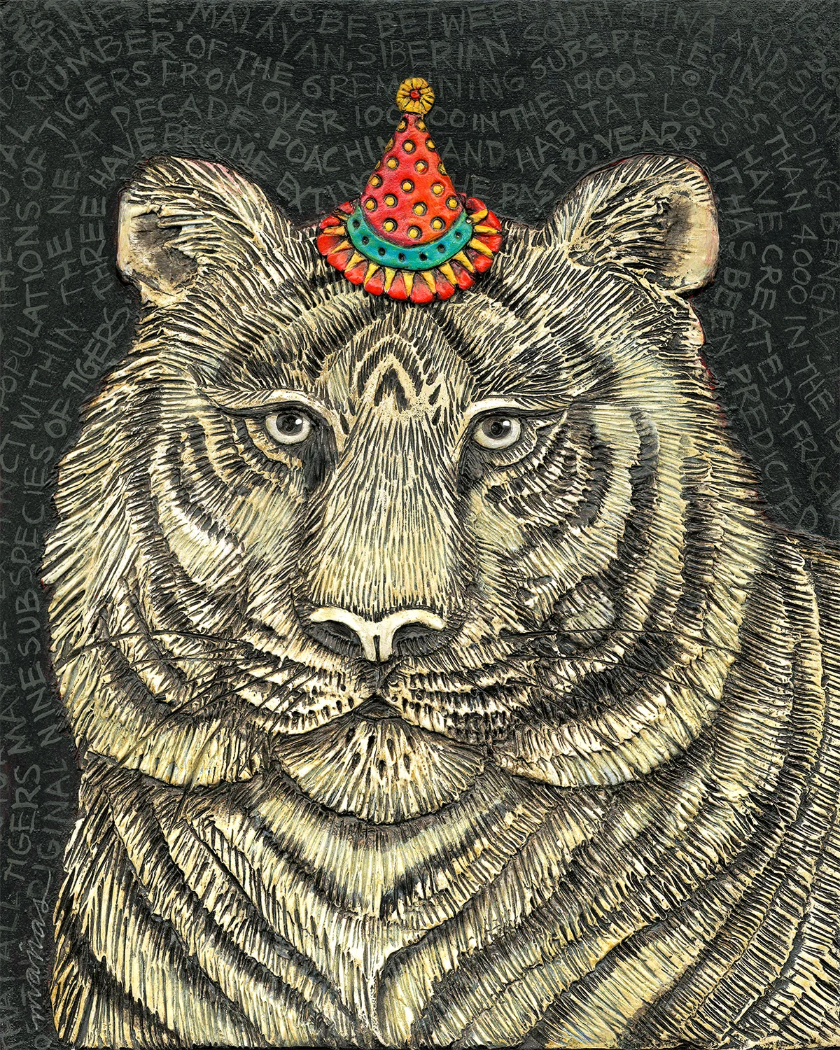 In an effort to raise awareness about what is happening to our most beloved animals, I started making animal portraits with paper clay on wood panels. Ideally, in time, and with a lot more animal portraits, I plan to create a traveling exhibit that encourages interest in activism and donating to help save these animals from extinction. The disturbing title, juxtaposed with party hats on the animals makes people read further to understand the meaning. The pieces are not for sale, but I do have cards, prints and t-shirts available for purchase and will eventually add them to my shop. A portion of the proceeds from those sales will be donated to conservancy organizations.